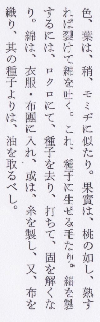 開花後60日ぐらいすると実がさけて、わたの毛が見えてくる。このとき熟したものからとり入れる。